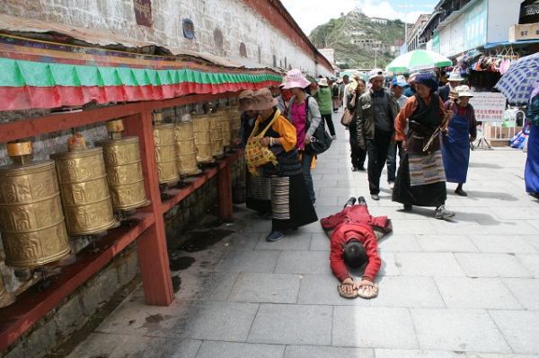 去年暑期10天的西藏之行,终于圆了我多年的西藏之梦。不来西藏,你根本无法领会“朝圣”这两个字的真正含义。 所到之处都可以看到手持转经筒和磕长头的信徒。据说一个虔诚的信徒一生中必须要磕10万次长头,他们希望通过今世虔诚的礼佛来换取来生的幸福。