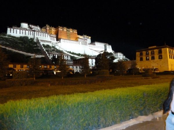 吃完晚饭后天已黑了一会儿了,我俩下楼走到北京街打了辆车去布达拉宫,问司机布达拉宫的灯光开到几点,他告诉我们整夜都开(后来我们在广场上才知道只开到23点),布达拉宫的夜景也非常非常美,要不是关灯那么早,我看很多人都会在那呆到午夜!