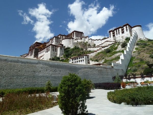 早晨起来问轻舟,她因高反几乎一夜没睡,不能陪我去逛布达拉宫了,我洗漱后就出门打了个车去布达拉宫,早晨的拉萨大街上车很少,不一会儿我就到了布达拉宫西侧门,拿着头天领的预约券到窗口买上票(100元一张),我谢绝了几个要给我当导游的,一个人慢慢地往上走,到安检处才知道这里也像世博会和奥运会一样不让带水,可惜了我刚泡好的一大杯陈年普洱!只能倒空了杯子才让进。