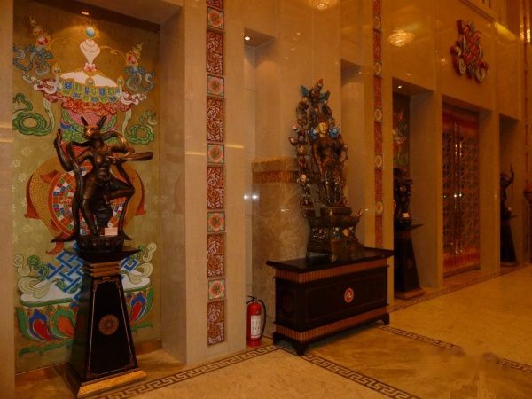 坐上车,享受着高原明媚的阳光,不到半小时,我们就到了位于拉萨城东南角的雅鲁藏布江大酒店,这是拉萨最高档的(好像是四星级)藏式宾馆,同时也是个博物馆式的宾馆,宾馆的大堂和每层楼的走道都摆满了西藏风格的工艺品,房间里的设计也很温馨舒适!这是我住过的星级宾馆中最让人难忘的!能有机会认识这个酒店还要感谢在共产党企业那里混饭的大学同学,是他坚持要为我买单(让他在拉萨的生意伙伴接待)才让我有机会发现这个酒店!否则以我的消费习惯一般是不会选择这么高档的酒店的,何况还要考虑同行旅伴的承受能力!不过,下次去拉萨,我会再次自己掏钱住这个酒店(携程网上订的标价好像是800多),同时建议大家即使不住,也要到雅鲁藏布江大酒店去感受一下,在那安逸舒适的大堂酒吧里坐一坐!