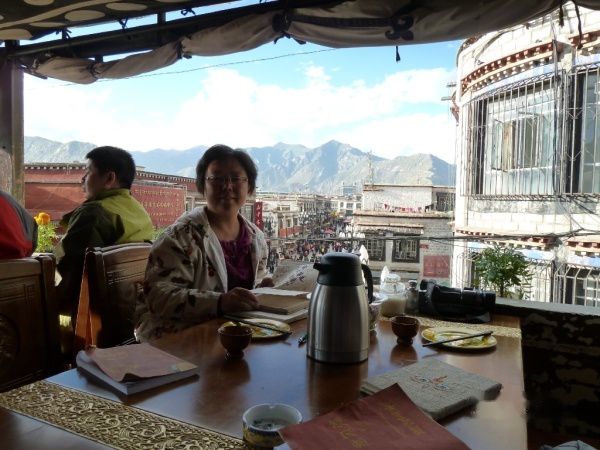到了著名的“大昭寺”门口,虽然我们俩都因对那尊佛祖德等身佛像没什么兴趣而不想进去,但在门口看看那些叩长头的善男信女还是很惬意的,轻舟还在门口拍了好长时间的录像!不经意间,两人逛到了“玛吉阿米”餐吧路口,想起浪漫而多才的仓央嘉措,我们也进了这家著名的餐吧,没想到来这里吃饭的人还挺多,有高反的轻舟才爬到二楼,嘴唇就发紫了,可惜二楼坐满了人,我又上了三楼找座,发现一个女人坐在一个四人桌旁,赶紧客气地上去商量是否可以拼桌,对方也很爽快地答应了!我这才回身去叫还在二楼等消息的轻舟,本想下楼扶她上来,可这楼梯很窄,仅能容一人,只好看着她像个老人那样手抓扶手一步一歇地上来,好家伙!这高原反应还真厉害,到了三楼,轻舟的嘴唇都紫得发黑了!赶紧扶她坐下,对面的妇人说她也闹高原反应,她老公下楼去买葡萄糖去了,说话间,她老公拿着一盒葡萄糖注射液回来了,看到轻舟那摸样,爽快的夫妻俩劝轻舟也喝两支!