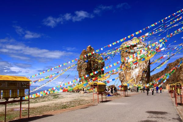 当我们一踏上扎西半岛,马上被湖边延绵的转经筒,被挂满经幡的山头,被神奇的迎宾石(也称“夫妻石”,是纳木措的门神),被湖边的玛尼堆所带来的宗教气氛深深感染,我们一开始就对这神秘的圣湖充满了崇敬。虽然不是转湖季节,但我们在扎西半岛的岩丛中攀走时,仍可以不时碰到转着经筒的藏民。我们不知道他们的所思所想,或许那天湖一色的圣洁,能让人感觉到纳木错隐藏着的不可企及的神圣,或许那迎风飘舞的经幡能留给人们对今生和来世的思考。它们似有一股超自然的力量可以左右人的情感,让人向往它,崇拜它,追求它,匍匐在它的脚下。