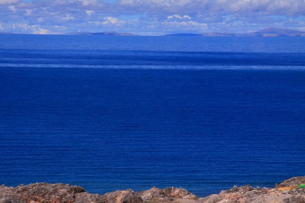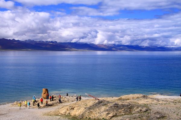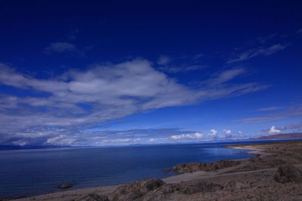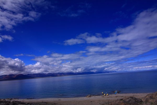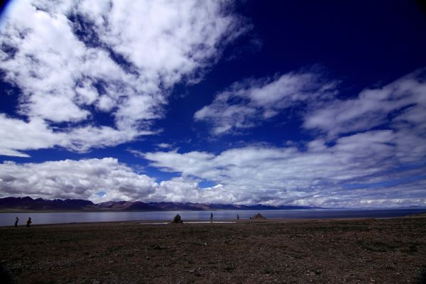 纳木错那纯净得天湖一色的湛蓝色彩几乎可以令人窒息,它会让你停止呼吸、停止思维甚至停止挪动脚步,但是它又会迫使你急欲融入这片色彩之中。这种地方不应该只来看上一眼就回去,这里是可以让人久久逗留和徜徉的地方。我们很后悔没有向旅行社坚持要求在纳木错住一夜,那样我们就可以看纳木错的日落和日出,还可能有幸看到纳木错沿湖的念青唐古拉雪峰。这次虽然天气不错,但是念青唐古拉雪峰仍被云层遮挡,要不然的话,我们可以看到一幅雪峰映衬着湛蓝的纳木错湖水的美景,这本是一幅经典的西藏长轴美图。