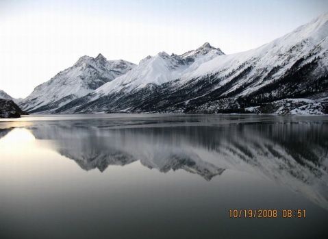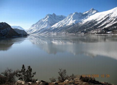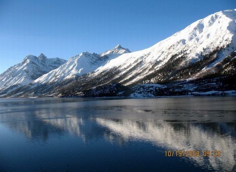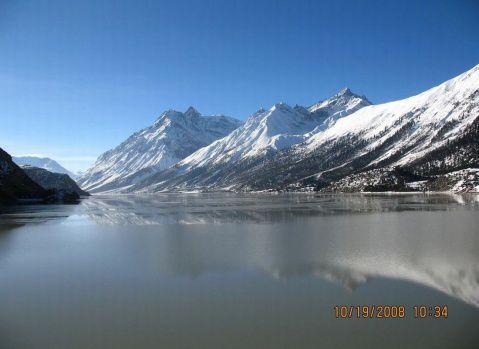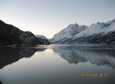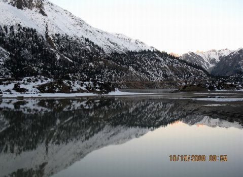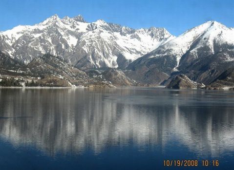可能是初冬的原故还是什么原因,湖水显的不是那样清澈,泛青色的镶在两边群峰怀抱之中。我在细致的观赏这湖光山色,如果将水与山分离,则两者都相当平淡,缺少一种立体的美,然乌湖则恰到好处地与大山融合为一体,互相映衬,互相呼应;组合自然,美不胜收。