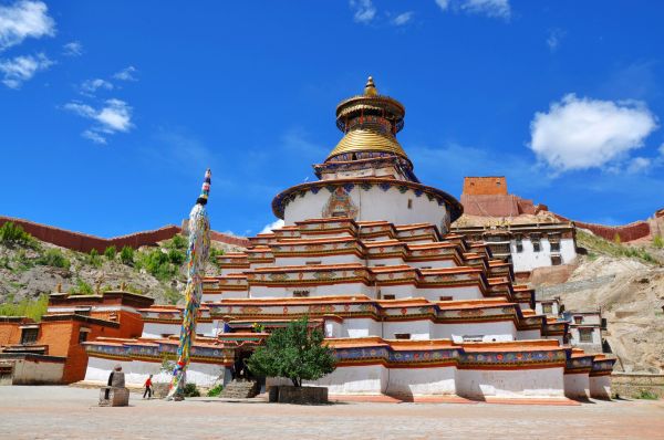 下午三点钟到达了江孜,江孜建城已有600年,比日喀则稍早,由于地处萨迦、后藏经亚东通往锡金、不丹的路上,且地沃物丰,因此成为商旅往来的交通要道,发展成为沟通前后藏的重要通衢,为西藏一大重镇。在江孜县中心的山顶上,屹立着一座城堡,这便是闻名中外的江孜宗山抗英遗址。今天,在宗山前面的广场上,矗立起了一座江孜宗山英雄纪念碑,以缅怀一个世纪前的抗英英雄们。江孜的白居寺之是一座名寺,主要有两大特色,其特色之一是一寺容三派,它原属萨迦教派,后来噶当派和格鲁派的势力相继进入,各派一度互相排斥,分庭抗礼。最后,还是互谅互让。于是,白居寺便兼容萨迦、噶当、格鲁3个教派,因而寺内供奉及建筑风格也兼收并蓄、博采众长。另一特色是白居寺的标志菩提塔,是由近百间佛堂依次重叠建起的塔,人称“塔中有塔”。塔内佛堂、佛龛以及壁画上的佛像总计有十万个,因而得名十万佛塔。它的正名菩提塔人们倒不大提起。藏语称这座塔为“班廓曲颠”,意为“流水漩涡处的塔”,这流水便是年楚河。