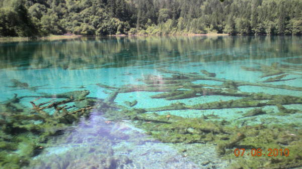 五花海的底部景观妙不可言,湖水一边是翠绿色的,一边是湖绿色的,湖底的枯树,由于钙化,变成一丛丛灿烂的珊瑚,在阳光的照射下,五光十色,非常迷人。五花海有着“九寨精华”及“九寨一绝”的美名,站在五花海最高点,即老虎石上俯视,可一览五花海全景。此处也是九寨沟最佳取景点之一。虽说,没到最漂亮的秋日,但夏日的五花海也美得让人咋舌。