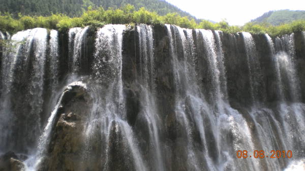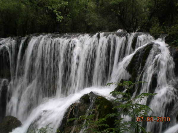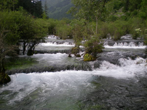 4点半,则查洼沟段就开始“赶游客”,我们乘车下行到树正瀑布。树正瀑布在树正寨附近,是九寨沟内第一个瀑布群,一连串40多个海子绵延7公里形成多层台阶。上层台阶海子里的水,从海子边缘全线溢出,形成瀑布,注入下一层台阶的海子,有多少层海子,便有多少层瀑布。落差最小的只有一二米,最大的可达30米。刚下了雨,这儿也是氛外壮观。
