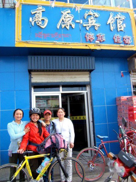 刚察县城沙柳河镇,与高原宾馆的老板和伙记合影。刚察是个富有人情味的县城,居民主动帮助別人,宾馆服务精神佳。