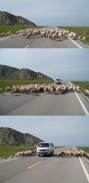 成群的羊儿很霸道,占用公路,却懂得让路。