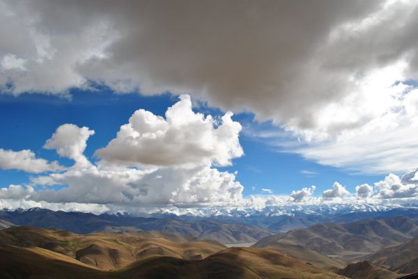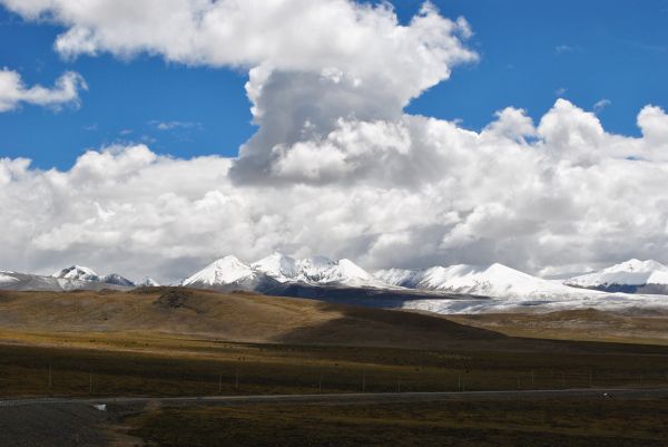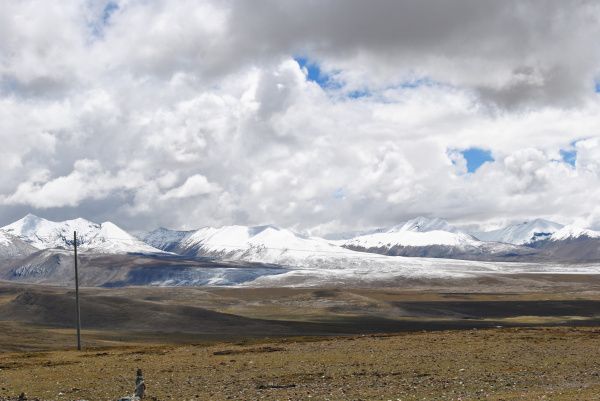 在到达珠峰景区的山口时,远处已经出现了成片的雪山。