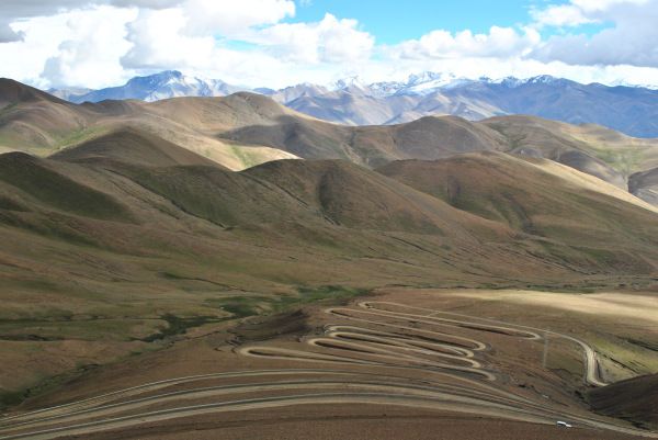 下山时拍到的盘山路和远处被积雪覆盖的喜玛拉雅山脉。