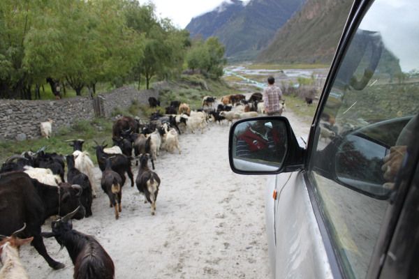 正前方出现了一群山羊,任凭师傅的喇叭有多响,山羊们就是不肯离开路面,无奈之下,我下车充当了临时羊倌。小玉趁机拍了张我的背影。