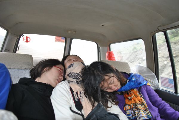 高度紧张过后,随着车辆的疯狂颠簸,后排座的MM们放松了神经,睡的是那么香,看着她们的表情,我有些难过,事先没做好功课,早知道这段路这么难走,就不选择这一路段了。