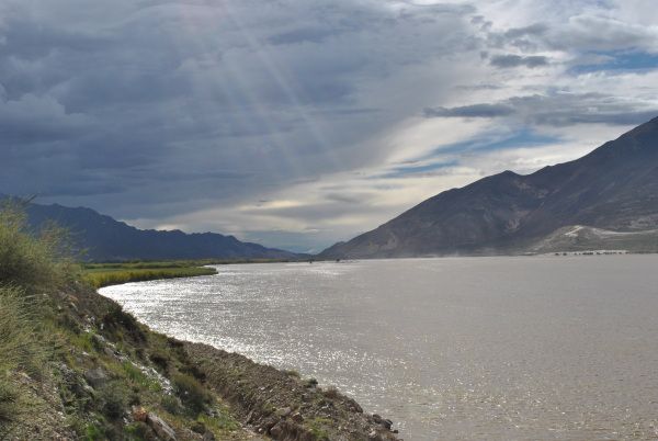 路的一边我们又见到了久违的河流,只是这条河的河水颜色有些貌似黄河,和这里荒凉的景色倒是很般配。几缕阳光从乌云中穿透,照在河中,难得的景色。