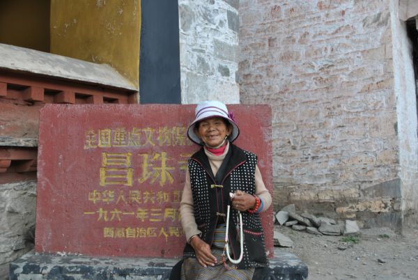 离开了雍不拉康后,我们前往昌珠寺,已是下午6点半,寺庙已经关门,我和小玉到马路对面去拍昌珠寺的全景,这时寺庙大门开了,师傅带着她们三个竟然进去了,我和小玉紧跑慢跑,到了门前,门被关上了,轻轻的敲了几下门,也没人理会我们。真够郁闷的,他们四个进去了,把我和小玉扔外面了。这时,门前一个藏族老奶奶和我们打招呼,指了指夕阳,又指了指大门,我立刻明白了她的意思。看老奶奶很可怜,我和小玉给了老奶奶点钱,还给老奶奶拍了张PP,嘿嘿。