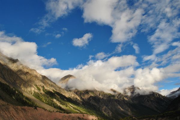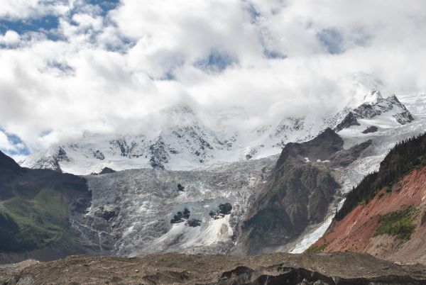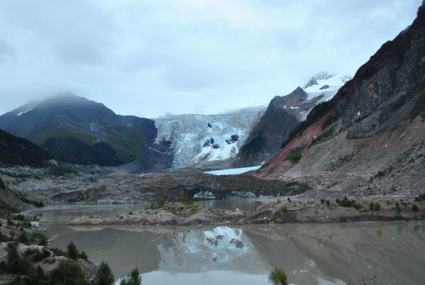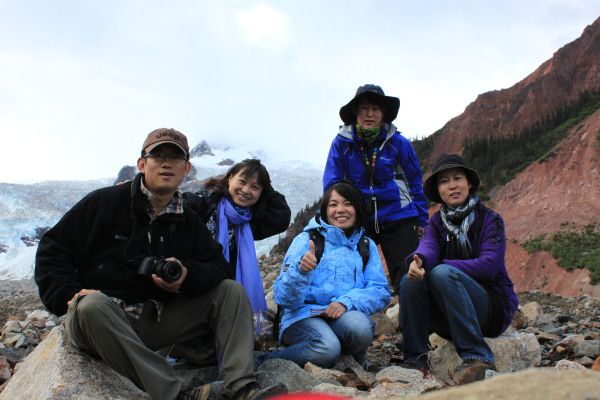 爬上了这座小山,远处的米堆冰川浮现在了大家的眼前。米堆冰川在远处的正前方,两边是山,左边山上的植被很茂盛,而右边山上却是奇峰异石,景色非常迷人。附清晨远处的米堆冰川。