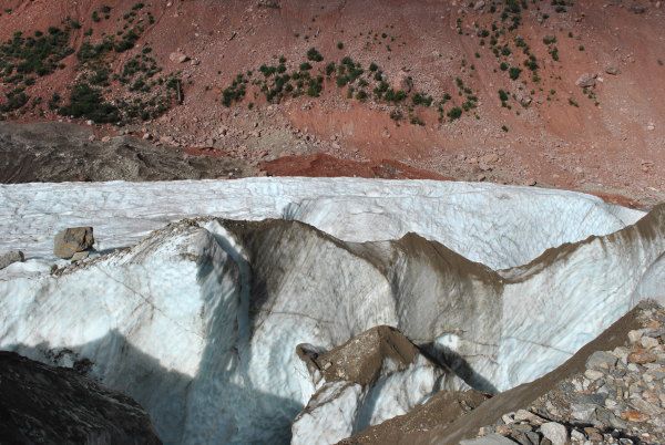 眼见就能一步踏上冰川下的冰湖了,忽然发现一道冰沟拦在了我们前面,走近一看,冰沟看不到底,里面有巨大的水流声,而且偶尔能听到冰川内部的巨大轰鸣声,感觉非常危险,小玉还准备进一步探寻个究竟,被我制止了,毕竟安全是最重要的。