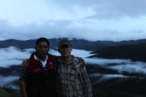 中午11点半,我们回到了“平措”家庭旅馆,师傅早已在那里等候多时,收拾行囊,向着林芝方向出发。沿路景色来的时候都已经欣赏了。再次路过鲁朗林海的时候,天马上就黑了,暗淡的林海景色和来的时候根本不同。非常遗憾的是相机在这个时候没电了,只能借用小玉的相机给我和次罗师傅来了个合照。