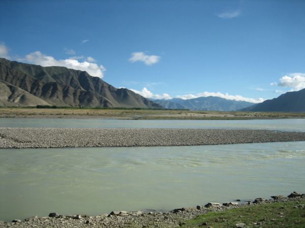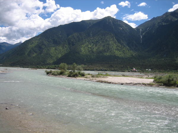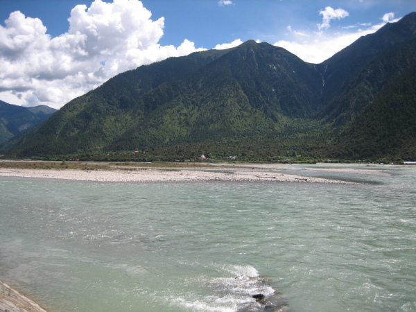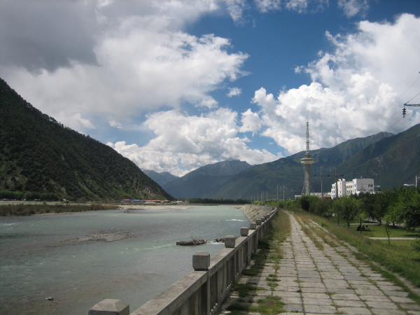 住下后出门来到尼洋河边,沿江堤走走,远处的青山,清澈的河水,蓝蓝的天空,低低的白云,一派世外桃园,唯一不好的是江堤上随地大小便留下的臊味及遗留物。