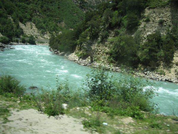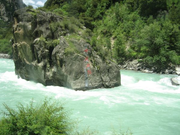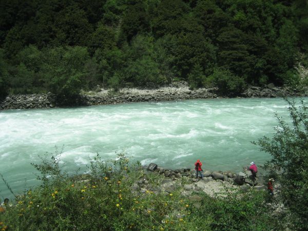 沿着清澈碧绿的尼洋河经过中流砥柱。