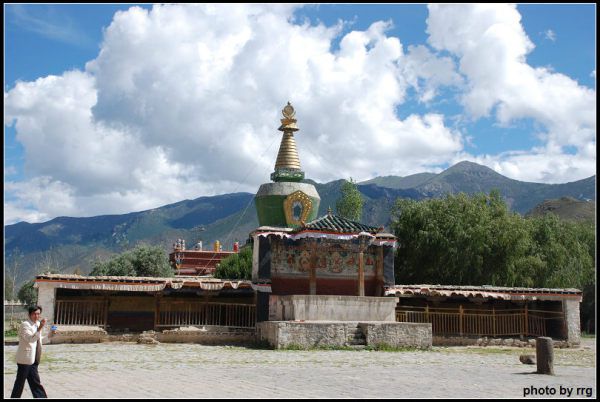 我站在乌策大殿门前的广场拍照。桑耶寺四面环山,有的山头竟有了些许的白雪。