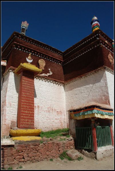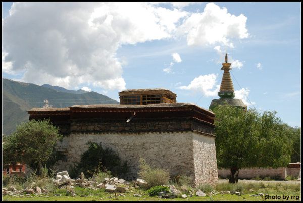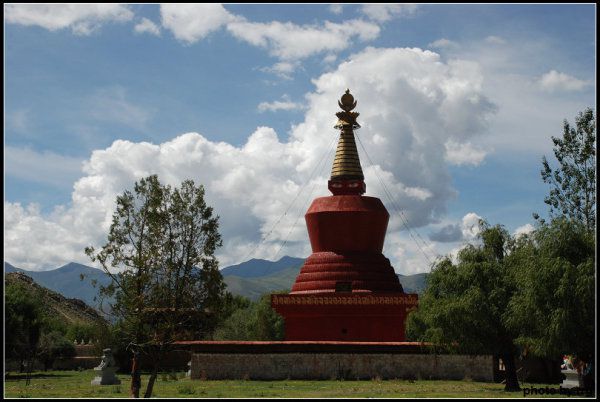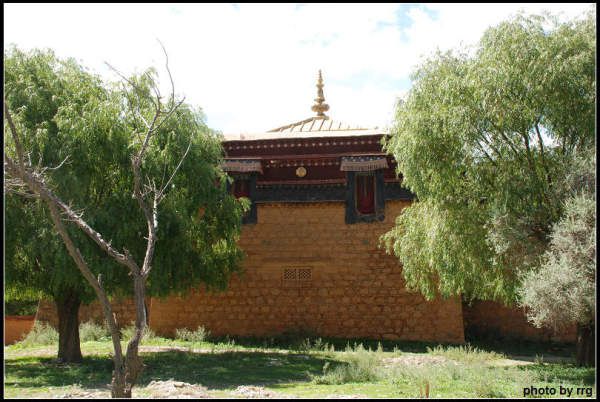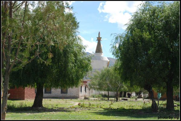 向西穿过草地树林,就是寺院西南角的红塔,它有一个粉墙围成的院落。