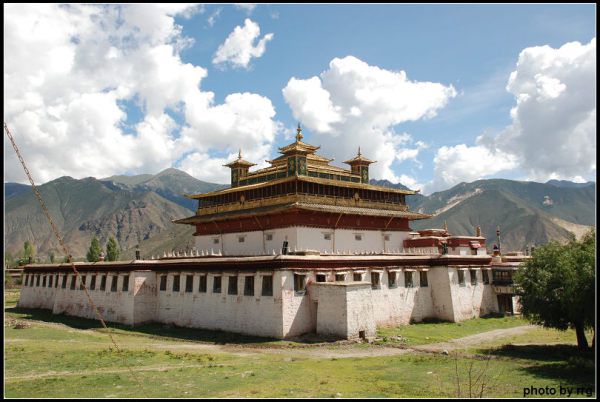 然后登上二层,在这里看到的乌策大殿和它的宏伟金顶,在远山、碧空和白云的映衬下,夺目的美丽。