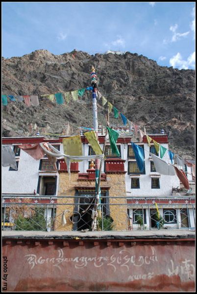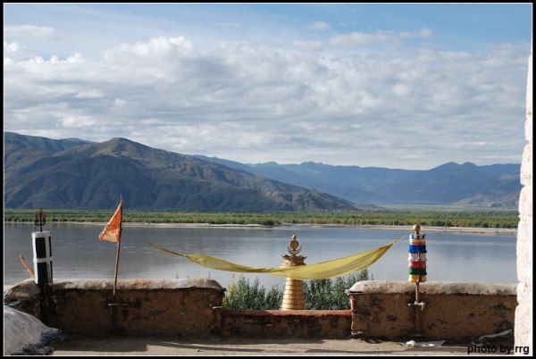 它的门前就是雅鲁藏布平静辽阔的碧蓝江水,而寺院的建筑,则依着一座险峻的高山,向上递接。山上布满五色的风马经幡。