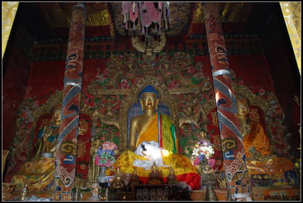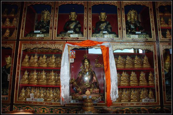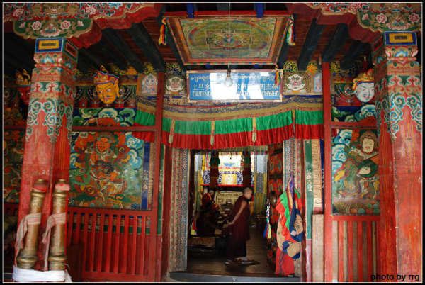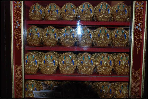 一个和善的喇嘛,带我们去供奉莲花生大师的殿堂。路上告诉我们说多吉扎寺主供莲花生大师,寺里有大师的坐像和千面像。