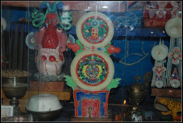 沿楼梯上到二楼,是大殿。殿内供奉释迦牟尼佛像,还有许多美丽的朵玛--一种由面团捏制的象征性礼仪贡品,上面装饰有酥油花制成的精美彩色图案,非常漂亮。殿内的古旧唐卡也非常珍贵。