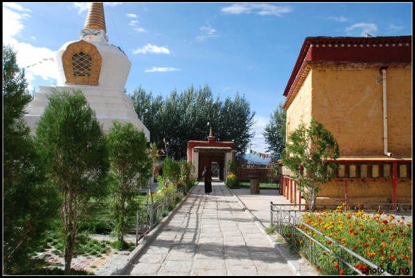 进入寺院,左侧是一座高耸的白塔,白塔前面是一个黄色的房子-玛尼拉康,内有一大的铜制转经筒。房子周边是一排转经筒。