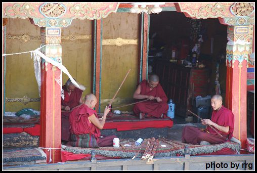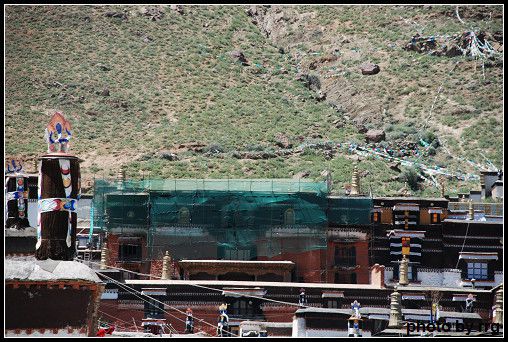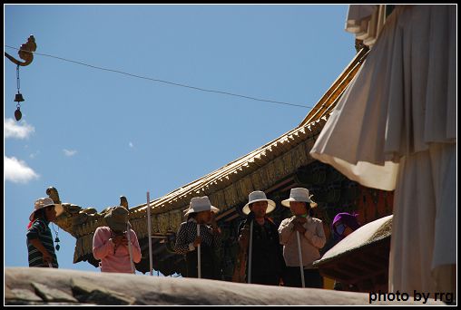 但是,正因为维修,我们才得以目睹"打阿嘎"的场面,据说这是死等也应该看到、所到的藏族人夯屋顶时的劳动歌。站在一处空地上,看得、听得入迷,境忘了拍照,录像,辛好同伴做了这些。