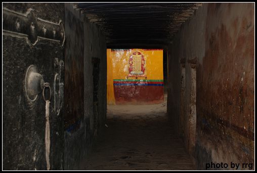 向西走过"曲康夏"高大院墙,是一个5O米长的隧洞。尽头就是五至九世班禅合葬灵塔祀殿“扎什南捷”(吉祥的天国)院墙明亮的反光。