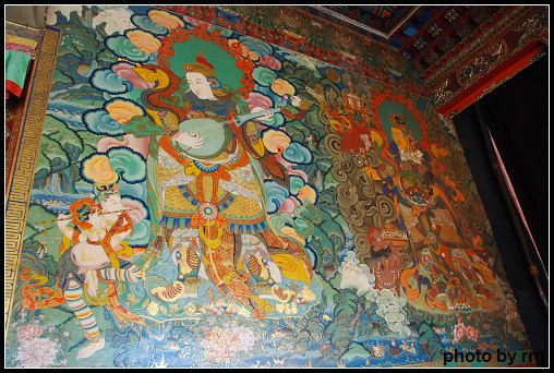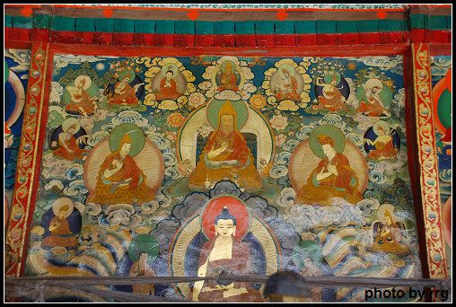 大殿内四周墙壁上绘有藏传佛教各教派的著名高僧业绩的壁画。