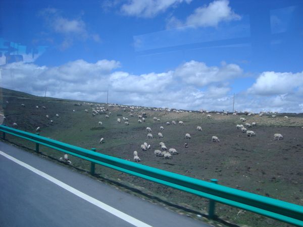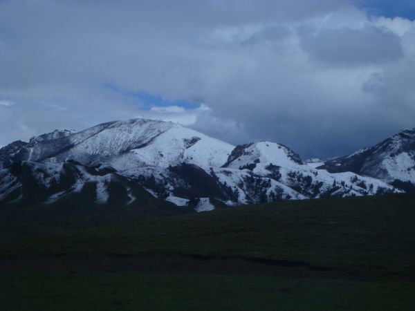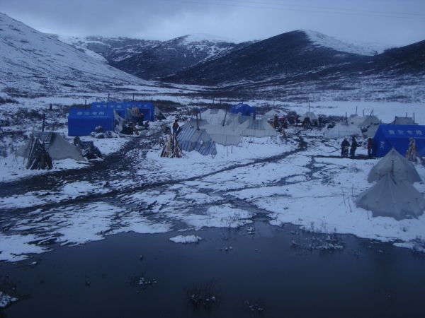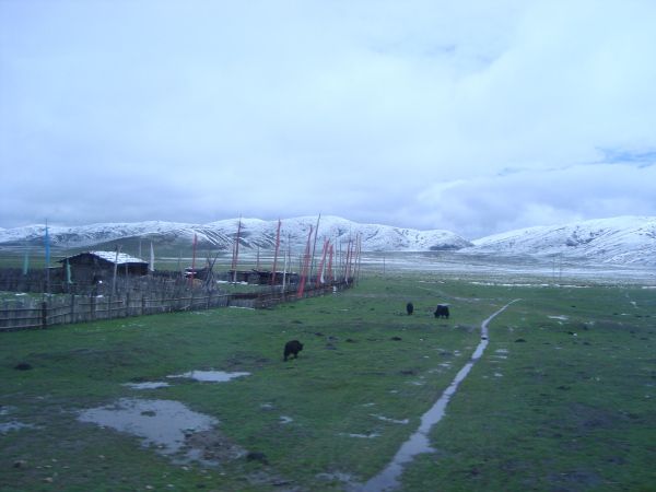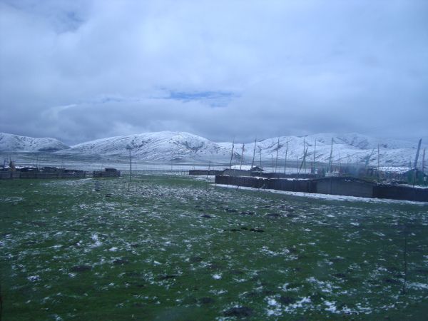 第二天早上,客栈老板告诉我们若尔盖昨晚下大雪了,我不由一喜有好风景看啰。汽车到川主寺后就转到一条宽敞平坦的泊油马路,路边山峰上的雪渐渐多了起来,随着海拔升高,两边白茫茫的一片,雪地之中时不时可见牧民的帐篷,简陋的帐篷在风雪中孤独的挺立着,放牧的牛羊象镶在白毯子上的黑珍珠。我的心一直激动着,呼吸着略带凉意的空气,目光贪婪的停在窗外,拿着卡片机不停的在拍,感受这难得一见的上天的恩赐。