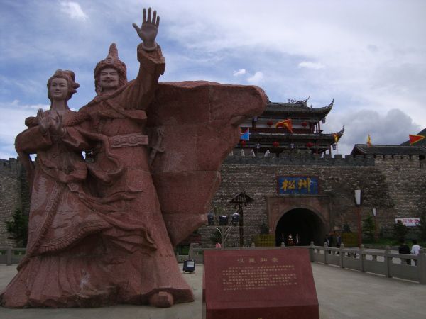 松州古城入口的标志性建筑物——文成公主和松赞干布成亲塑像。