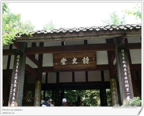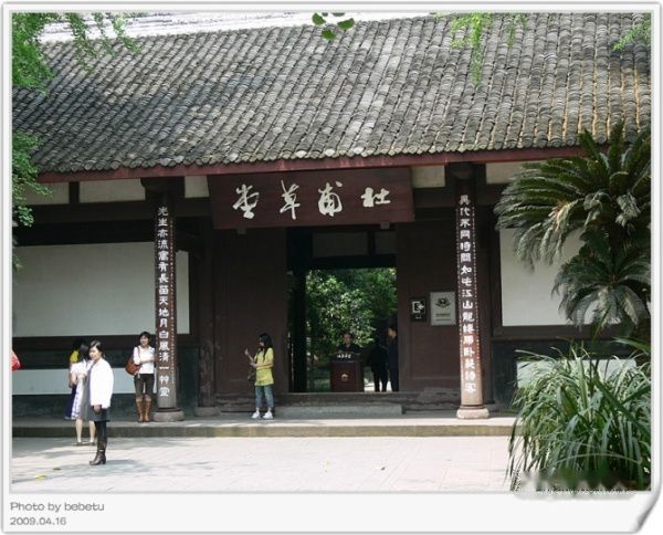 杜甫草堂坐落在成都的浣花溪旁,风景秀丽,空气清新,还有一公园在旁边。如今整个草堂附近都修葺成故楼模样,一片“古色古香”,周边马路上都雕刻有杜甫的诗,本人对诗的造诣仅仅停留在课本中,加之时过境迁,只记得“朱门酒肉臭,路有冻死骨”等几句,多半都还给杜老了,罪过啊罪过!