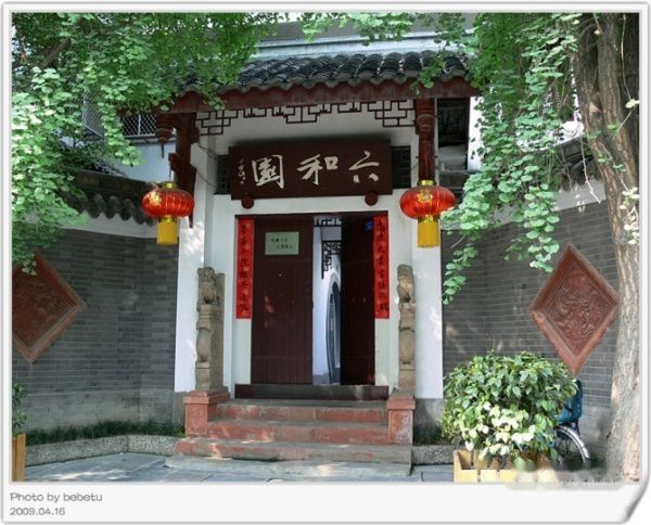 虽然大部分都拆了迁,但还有一部分民居被保存得很完好。比如说我偶然一抬头,发现有一家写着“六和园”牌匾的落款竟是:于右任。