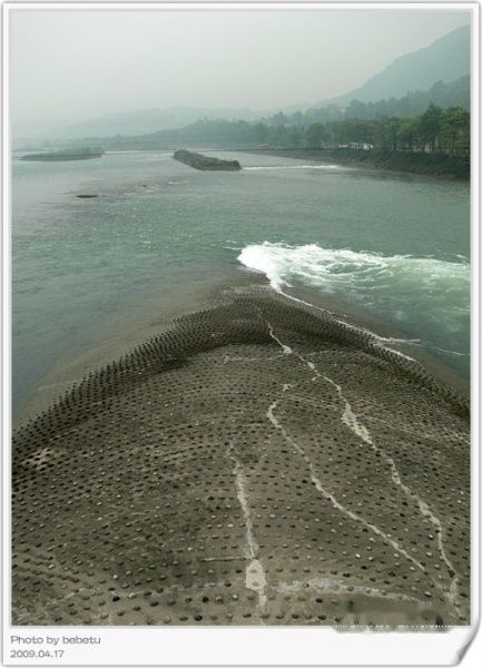 “鱼嘴”是都江堰的分水工程,因其形如鱼嘴而得名,它是修建在江心的分水堤坝,把汹涌的岷江分隔成外江和内江,外江排洪,内江引水灌溉。地震导致鱼嘴受损,那一条条的白斑就是修补的痕迹。