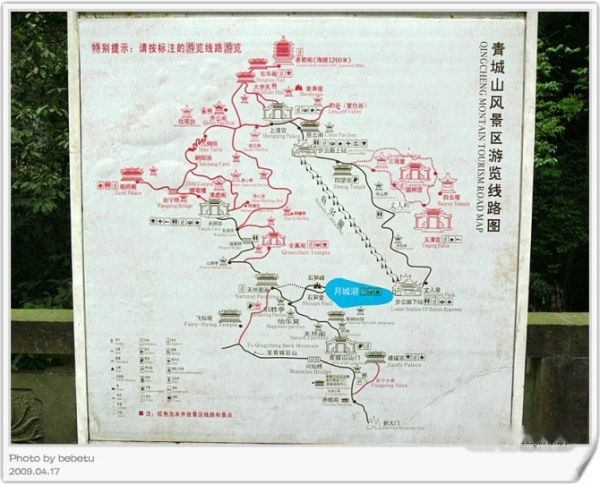 由于相对而言受损程度较低,青城前山依然“天下幽”,不过还是有不少景点暂停开放,下图中红色标注的区域大都是由于地震的影响而无法游览(最新消息:青城山天师洞黄帝祠已经在5月10日维修竣工正式迎客)。