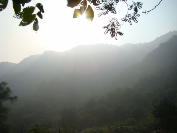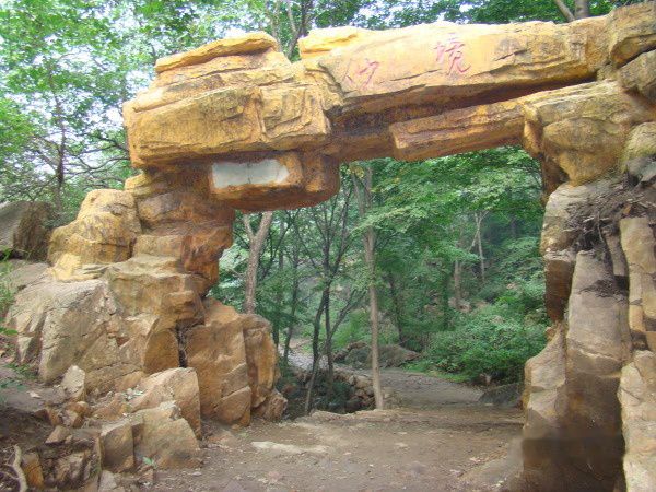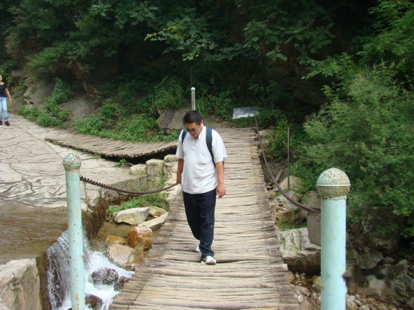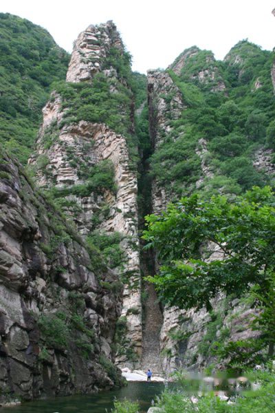 我们开车进山,拿着老板给的介绍信35元/张购票8张,进山后有电瓶车可以直接开到正式景点,省去前面的山路,往返15元单程10元。我跟上善若水两人(因为是司机。需要保存体力)跟电瓶车上行,臭臭、妖精等人决定徒步进山。佩服佩服,行进不久,就出现一个让人眼前一亮的景点,一线天。下图两山缝隙间是楼梯,可达山顶,妖精等人爬到顶端。(找他们要清晰照片后补图)