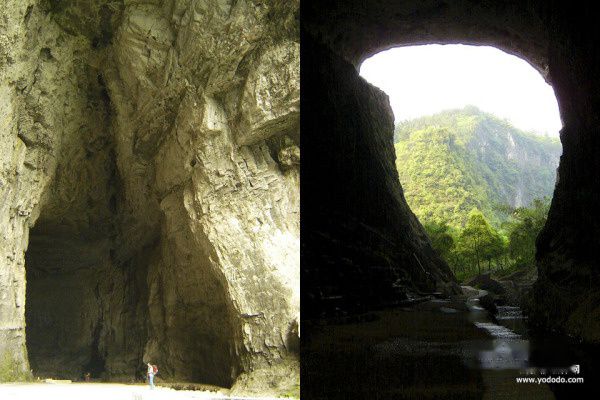 经过一高约三、四十米的石灰岩溶洞,溯溪入洞,两岸墙立。一侧的桃花溪水自潺潺出,清澈见底。有座貌似观音的钟乳端坐一侧,前面也放着供台大鼎。洞中滴水如珠、在石钟和石鼓上轻叩,声音清脆悦耳...洞外豁然开朗,别有一天地。其中田十余亩,四周环山,皆峭壁,仿佛与世隔绝。 真所谓“时光隧道今通古,桑竹田园主娱宾。”