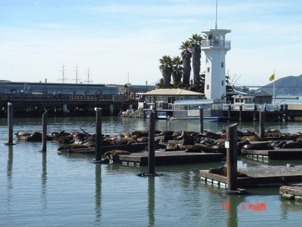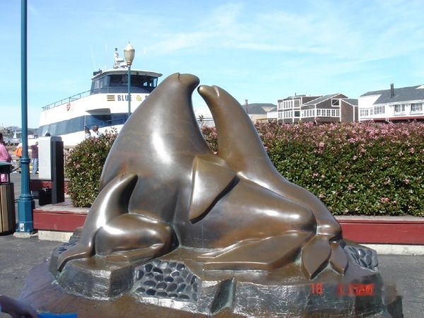 看到这个海狮雕像就离39号码头(Pier 39) 不远了,原来39号码头是卸货码头,后来成立了集餐馆商店于一体的超级市场。这里圈养着几十只海狮、海豹。味道的确很臭。
