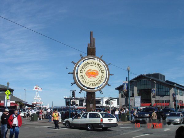 早期意大利移民靠捕鱼为生,渔人码头成为整个旧金山渔贩和餐馆的水产供应站,后来随着渔业的逐渐没落,旅游业兴起,取而代之。这个有个大海蟹的牌子就是渔人码头的标志。