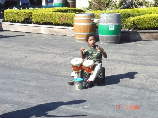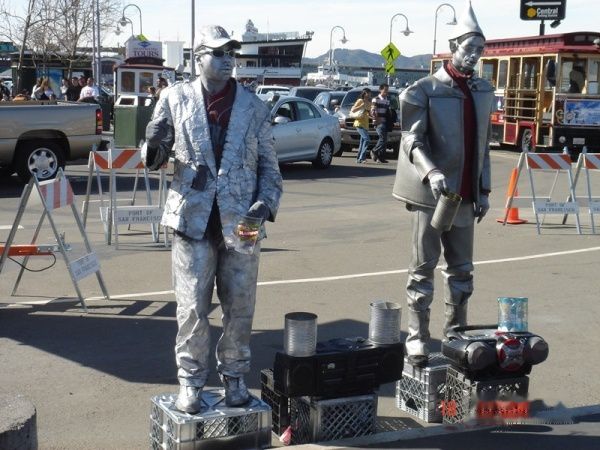 而路边的卖艺人,全身涂满银色涂料,左边的这个肩上和后背插着很多的小风扇,在他身体不断扭动和旋转中,这些小风扇也来回随他一起跳舞,像是长在他的身上一样。右边这位还扮演成了仙踪奇缘里面的铁皮人,再加上时尚的墨镜,不时扛起地上的录音机随着音乐舞蹈。国内的那些乞讨者应该向他们学习学习,至少要懂得人格自尊和金钱的关系。