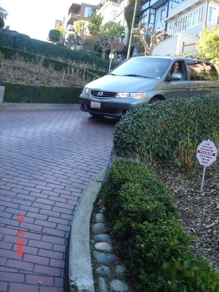 回去的路上,特地经过一下九曲花街(Lombard Street),那个时候是为了使繁忙的交通有所喘息而设计建造的,早期的居民喜欢在每个转弯处种上鲜花,在这个40度的陡坡上,有8个急转弯,因为道路非常狭窄弯曲,车子只能前进,无法倒退,被称为世界上最弯的街。所以会有很多人慕名前往,考验一下自己的车技,也就有很多的汽车排队等候下坡。
