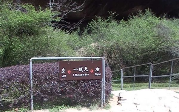 由于不知道风洞也是通道入口,就继续沿著山路向前走,直到看见一线天的标牌,奇怪的标牌还分左右,估计是有两个一线天的通道,于是就选择向右进入,实践证明,右路的通道更为。