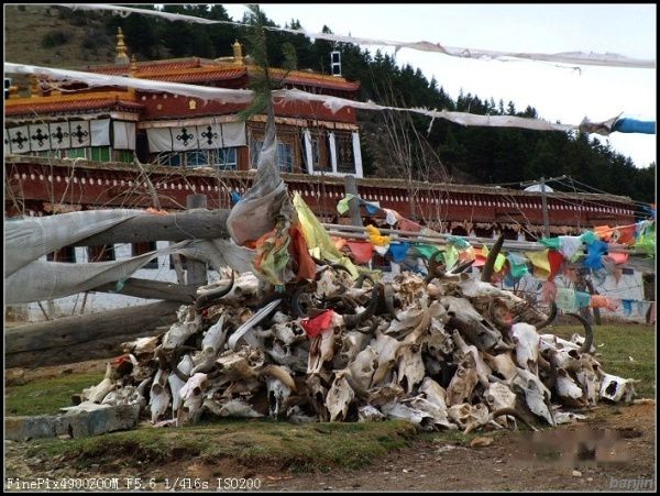 扎噶神山前牦牛头骨堆积的玛尼堆