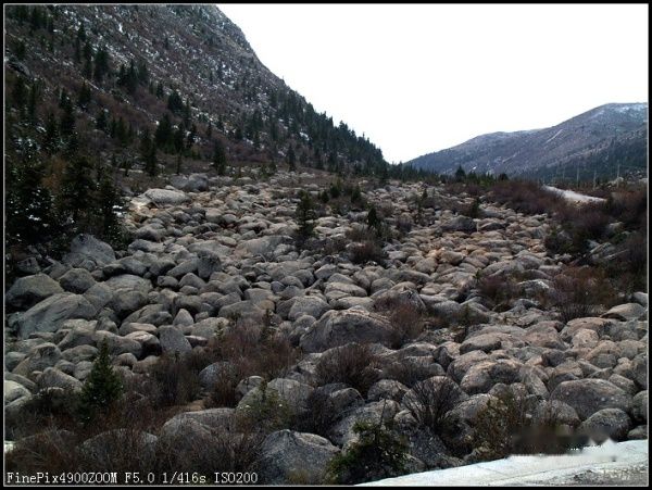 过了扎噶几乎是“直奔”海子山而去,到了山脚下开始进入盘山路,开始是那种一会向东一会向西的爬法,所以显得坡度并不大,随着海拔升高,盘山路开始多弯,经常有那种“发卡弯儿”出现了,路边的景色也在悄然告诉你,海拔接近4000米了,再向前就是铺天盖地的大石块儿,拥挤在沟里,堆积在路旁,抬眼望去整个一座山就像个巨大的石头堆,恍惚间会错以为误入了采石场。这就是著名的第四纪冰川留下的古冰帽遗迹,环境恶劣无人居住,满目都是由地壳运动海底上升留下的巨大石块。
