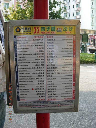 终于换到了澳币,我和LG走到地下的公交车站找车直接去凼仔。澳门的公交车很奇怪,分ABC道。比如34C和34A都去的是不同的地方。我走到直接去凼仔的34C公交站的候车处,正好碰见一对母子也在候车,所以我充分发挥自己不耻下问的优点问那对母子去凼仔的官也街需要多少钱,他们说是3.3元/一个人。我就捧出来一堆我刚才换好的硬币,一个一个数。准备数出来6.6元坐车。一块的硬币和5元的硬币还好。但是我怎么都找不出1毛的硬币。那个小朋友眼疾手快,抓出我手里的一个最小的硬币说,那个就是一毛的。我才知道,我一直把它当成了一毫钱。还纳闷为什么澳门还有一毫的硬币。物价也不算低啊。